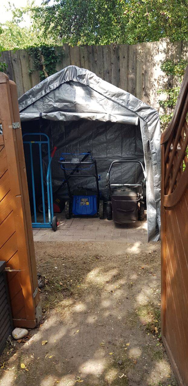 In mühevoller Handarbeit wurde von Michael G. hierzu eine stabile Bodenplatte aus Pflastersteinen gefertigt, auf die er letzlich ein Wasserdichtes Zelt montiert. So sind unsere Mäher trocken untergebracht und der Aufsitzmäher bekommt den Platz im Geräteschuppen.